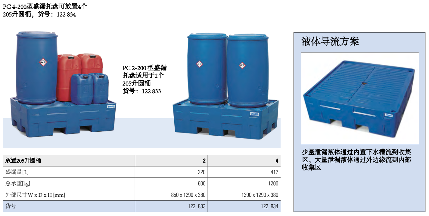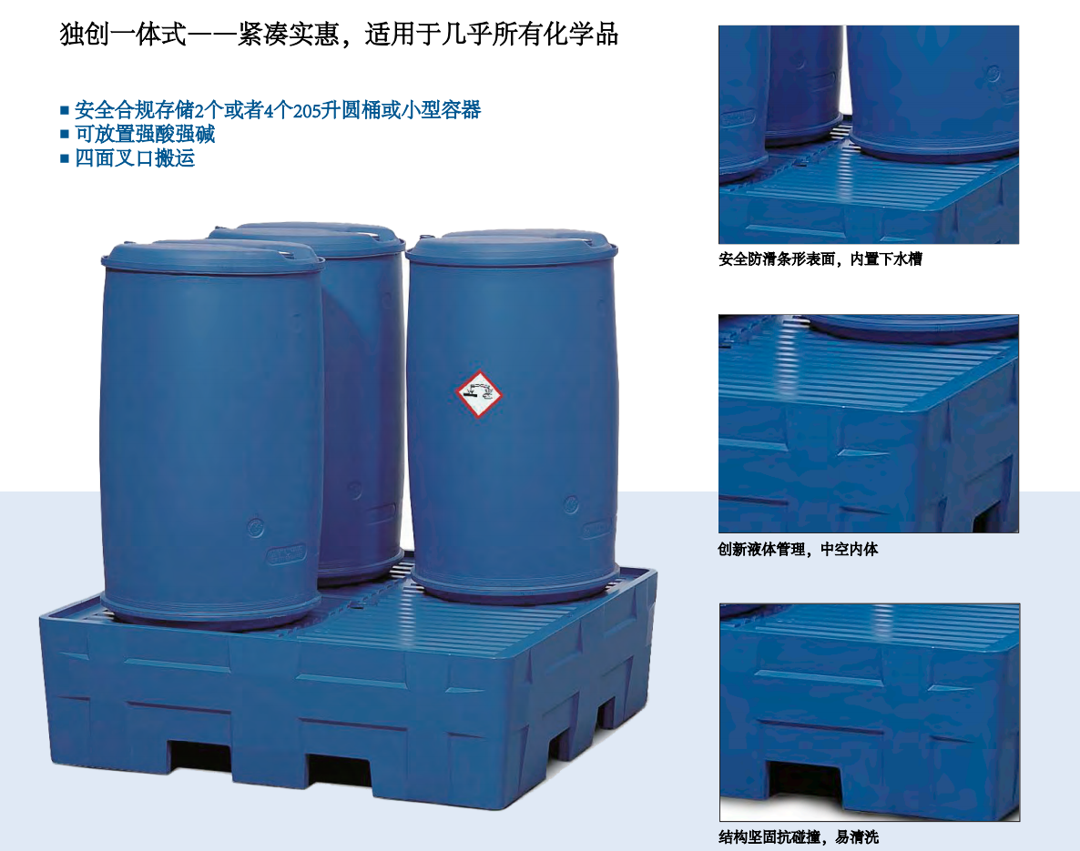 可用于存储4个205升圆桶(在一个化学托盘上)或1个1000升IBC吨桶,