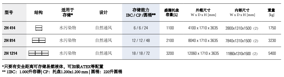 可用于存储4个205升圆桶(在一个化学托盘上)或1个1000升IBC吨桶,