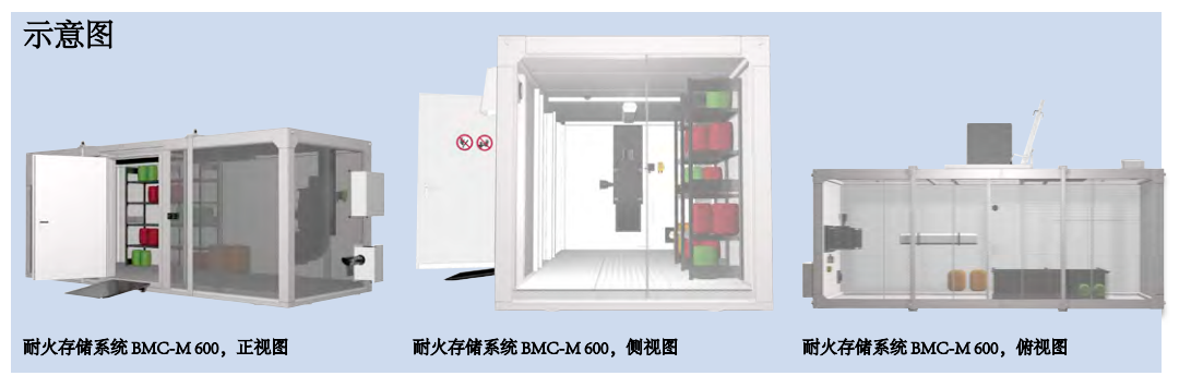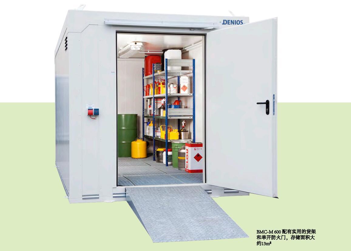 BMC-M 600 配有实用的货架和单开防火门,存储面积大约13m²,测试合格的90分钟内外防火产品。BMC-M可以配置各种样式的货架,优化存储空间和放置小型容器。BMC-M足够灵活,也可单独放置大型容器,例如205升的圆桶。