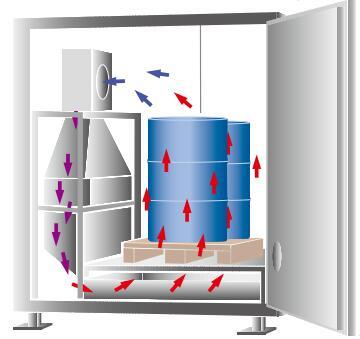 我们把加热系统和空气再循环系统的有效地组合起来,以确保较短的加热时间和均匀的温度分布。加热系统示意图:容器周围的湍流被有效加热